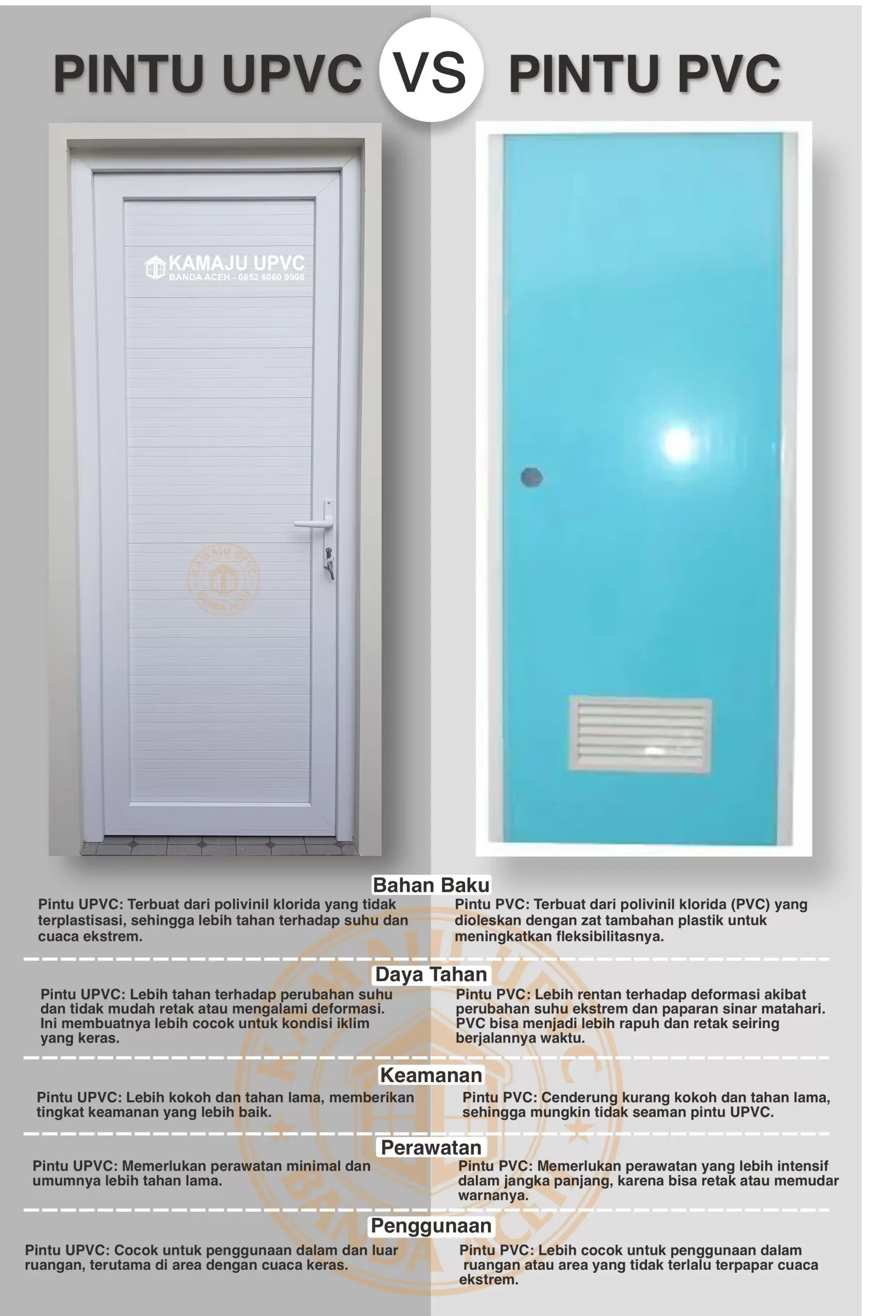 Untuk mengerti tentang pintu uPVC harga murah ini, ada baiknya anda mengerti perbandingan harga dengan jenis pintu lain. Misalnya, pintu kamar mandi uPVC dengan harga pintu jenis plastik PVC. Berbeda dengan PVC, uPVC tidak menggunakan plastik sebagai bahan dasarnya. Meskipun bahan uPVC adalah pengembangan dari bahan PVC.